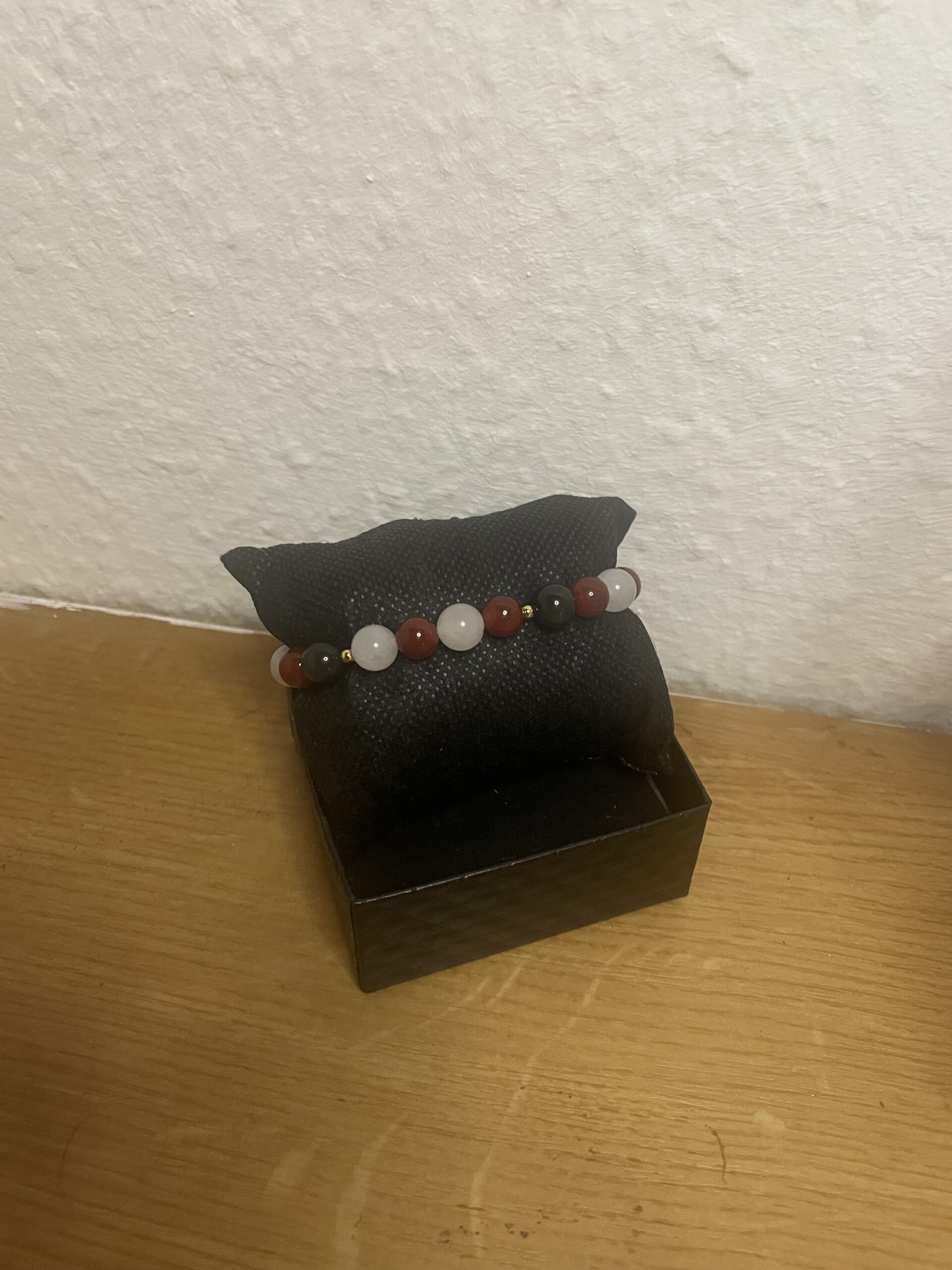 Made with Black Obsidian, Moonstone, and Red Carnelian, the bracelet carries a total of 21 beads — a number symbolizing completion, creation, and transformation (3×7).
